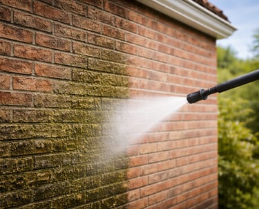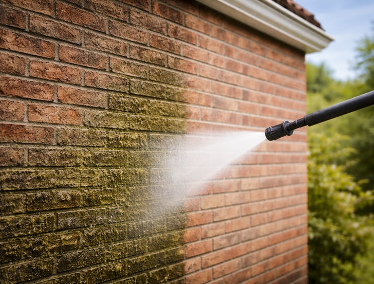 Verwijderen van algen, aanslag en vervuiling met lage druk. Een veilige methode die geschikt is voor veel soorten gevels en geen schade veroorzaakt aan steen of voegen.